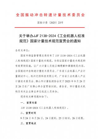 国家市场监督管理总局发布的JJF 2138-2024《工业机器人校准规范》即将在广东佛山开展宣贯培训。